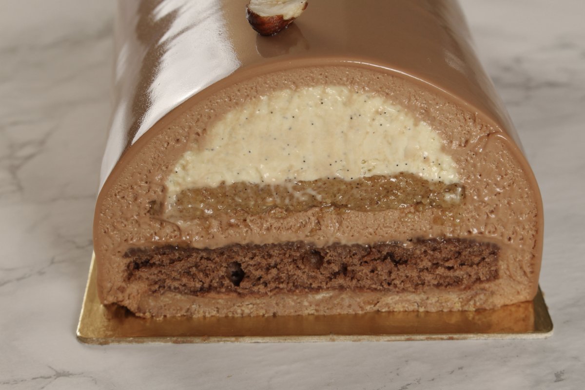 Croustillant praliné noisette chocolat, biscuit moelleux chocolat, crémeux vanille, praliné noisette, mousse aux deux chocolats brun et noir.